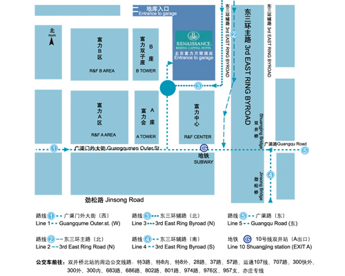 場(chǎng)館交通信息 名 稱:北京富力萬(wàn)麗酒店 Renaissance Beijing Capital Hotel 公 交:特3路/特8外環(huán)主路/特8快車內(nèi)環(huán)/特8內(nèi)環(huán)主路/特8快車外環(huán)/特8外環(huán)/特8內(nèi)環(huán)/28路/7區(qū)間(高峰車)/37路/57路/運(yùn)通107線/214夜班/300內(nèi)環(huán) 300快車內(nèi)環(huán)/300快車外環(huán)/300外環(huán)/348路/683路/686路/707路/801路/802路/974路/976區(qū)間 雙井橋北站下車 地 鐵:10號(hào)線雙井站下