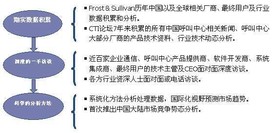 Frost & Sullivan 和 CTI論壇(www.efortunetech.com)共同組成的調(diào)研小組,在查閱了大量資料的基礎(chǔ)之上,以企業(yè)通信及呼叫中心的設(shè)備應(yīng)用、投資計(jì)劃以及相關(guān)廠商的市場(chǎng)表現(xiàn)為出發(fā)點(diǎn),通過(guò)對(duì)企業(yè)通信及呼叫中心重要應(yīng)用企業(yè)、在市場(chǎng)占主導(dǎo)地位的二十多家設(shè)備廠商、二十多家軟件開發(fā)商、十幾家系統(tǒng)集成商、數(shù)家外包運(yùn)營(yíng)商的深度訪談,參閱內(nèi)部相關(guān)報(bào)告及數(shù)據(jù)庫(kù),對(duì)數(shù)據(jù)的來(lái)源和數(shù)據(jù)的準(zhǔn)確性進(jìn)行了詳細(xì)核對(duì)與論證;憑借參與調(diào)研人員的多年從業(yè)經(jīng)